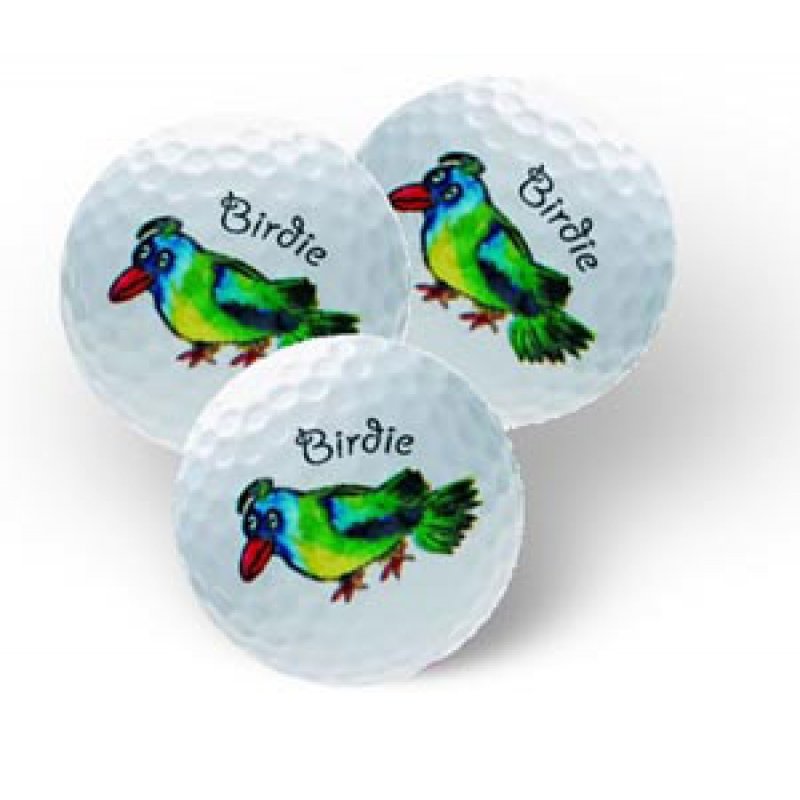 Sie erhalten drei Marken- Golfbälle mit einem bunten Vogel und dem Aufdruck "BIRDIE". Diese Golfbälle sind ein gern gesehenes Geschenk nach einem aussergewöhnlichen Birdie auf der Runde - oder auch als Ansporn für ein verpasstes Birdie.